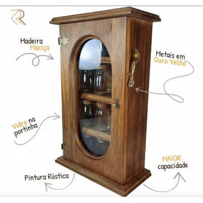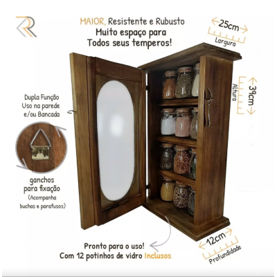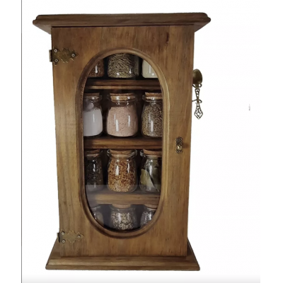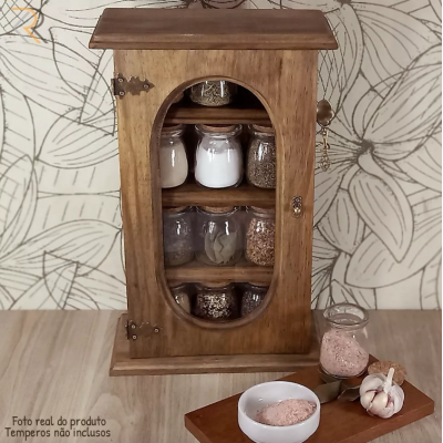 Product made with 100% recycled solid wood, with 4 shelves, supporting 12 glasses for seasoning (3 on each shelf), wooden port and hinges and metal handle, closing with a delicate spoon replacing a latch for the door (see details in the photos) so you can organize your favorite spices always at hand.