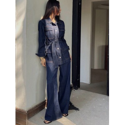Dazy Tall Tall Women's Denim Jacket With Collar And Belt, And Matching Denim Pants, Casual Suit